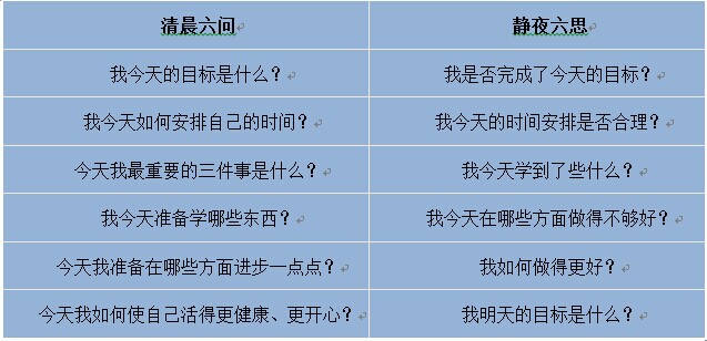 有公司管理人員專門設(shè)計(jì)了一個(gè)“員工每天自我思考六問(wèn)六思”表,在很多企業(yè)運(yùn)行,并且反映效果不錯(cuò)。
