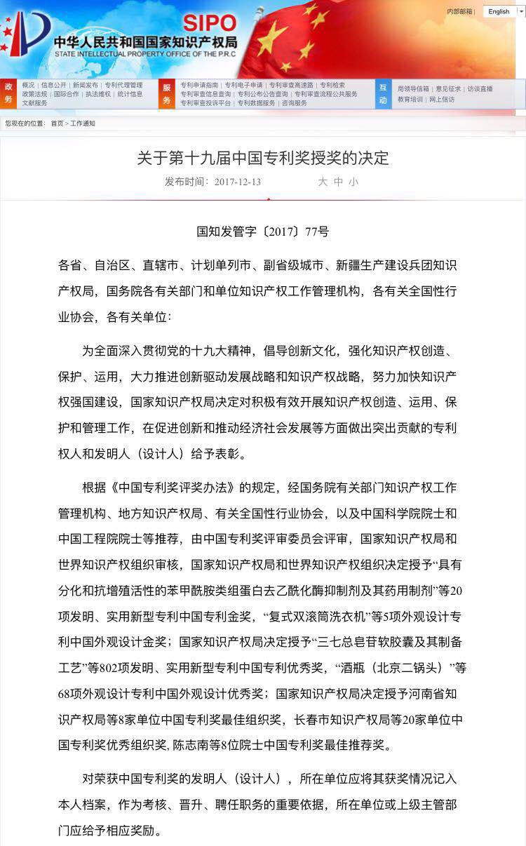 榮獲第十九屆中國發(fā)明專利優(yōu)秀獎,是孝感歷史上專利榮獲的最高獎項。