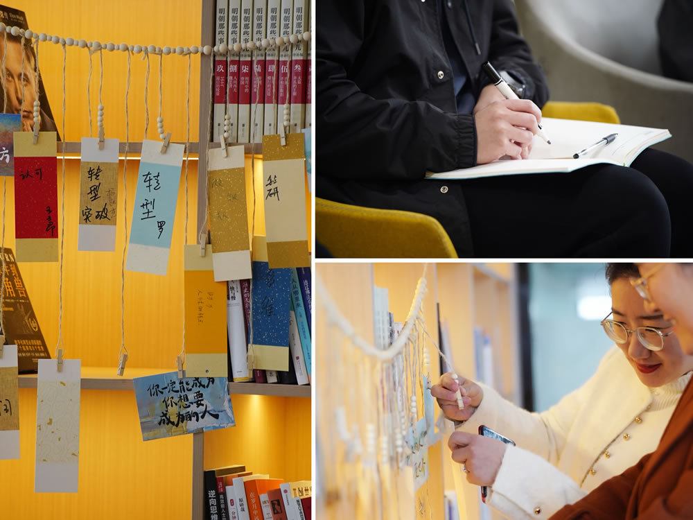 活動開場后,每位參與者以“2025年最想突破的職場關鍵詞”為引,寫下新年的成長期許。回盛書友們將關鍵詞書簽懸掛于讀書室主題墻,再以"可落地行動項+計劃閱讀書目"構(gòu)建年度閱讀企劃。