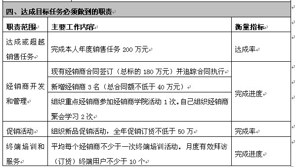 以下舉例說明同一崗位兩種不同版本的崗位說明書,對銷售人員達(dá)成銷售目標(biāo)的直接影響:
